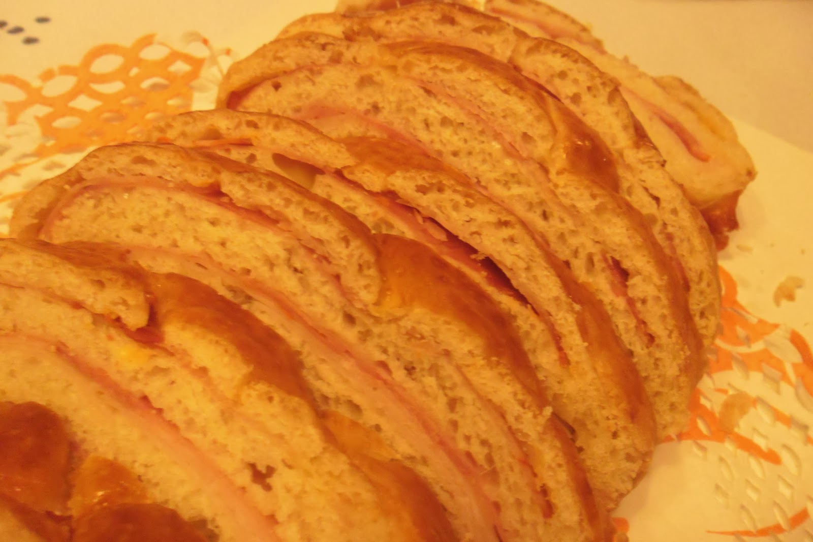 4. Numa superfície polvilhada com farinha e com a ajuda de um rolo estenda a massa de modo a que forme um retângulo,  coloque os ingredientes escolhidos no meio e dobre uma das pontas da massa para o centro a cobrir os ingredientes repita o processo colocando os ingredientes e volte a fechar com a restante massa, dobre as pontas, pincele com uma gema  e leve ao forno pré-aquecido a 220ºC cerca de 20 minutos.